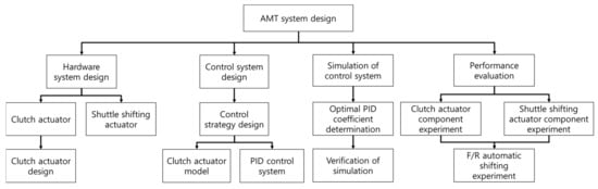 The overall experimental procedure for the development of the tractor AMT system in this study is shown in Figure 1. The development of the AMT system was performed in the order of hardware system design, control system design, simulation of control system, and performance evaluation. First, in the hardware design section, the clutch and shuttle shifting actuators—which are main components of the AMT system—are designed. The shuttle shifting actuator is operated with the disconnection of the power, while the clutch actuator is affected by a rotating power of flywheel. Thus, the performance of the AMT is more affected by the performance of the clutch actuator than the shuttle shifting actuators. In this study, the clutch actuator was designed in consideration of the required clutch force and a commercial product was selected and used as the shuttle shifting actuator. Second, proportional–integral–derivative (PID) control was used to control the position of each actuator. The optimal PID coefficients were determined through a simulation-based control response performance evaluation. As a commercial actuator-motor was used, the control system of the actuator was calibrated and developed with a focus on simulation and experiments with the actuator components, rather than dynamic model analysis. Third, the simulation program was developed to evaluate the optimal PID coefficients and evaluate the position control performance of each actuator. The optimal PID coefficients were selected considering the response performance and the simulation-based position control performance was verified by comparing the simulation results with laboratory experiments. Fourth, component experiments on the clutch and the shuttle shifting actuators were performed in the experimental test-bed. Finally, the applicability of the AMT system was confirmed through the results of the F/R automatic shifting experiment.