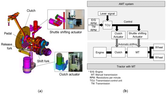 (a) AMT system layout including shuttle shifting actuator and clutch actuator; and (b) schematic of the AMT system combined with a manual tractor.
