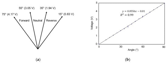 In this study, a commercial actuator for shuttle transmission with a voltage of 12 V, rated torque of 294 Nm, rotational speed of 45 RPM, and current of 5 A was used. A shuttle shifting actuator was developed to shift the shuttle gear of a synchromesh-type and connect to the shuttle linkage. The shuttle shifting actuators were controlled by an input voltage (0–12 V), and potentiometers were installed in each actuator for position control by rotation of the motors. The position ranges of the shuttle shifting actuators were decided by rotational displacement of the motors. The ranges of the shuttle shifting actuator were divided into 20° intervals from 15° to 75° at reverse, neutral, and forward, as shown in Figure 5a. The potentiometer ranges of the shuttle shifting actuator, as described above, were determined experimentally. The potentiometer mounted inside the shuttle shifting actuator was calibrated using an external potentiometer (SP2800, Novotechnik, Germany). The potentiometer calibration result of the shuttle shifting actuator showed a coefficient of determination of 0.99, indicating that closed-loop control using the potentiometer of the shuttle shifting actuator is possible, as shown in Figure 5b.