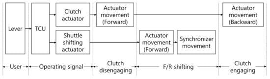 As the AMT system performs clutch engagement and F/R shifting using electric actuators, the position control of the shuttle shifting actuator and F/R actuator control the major performance of the AMT. The position of each actuator was controlled by a slightly different method, to suit their purposes. The position control of the shuttle shifting actuator was performed such that the settling time and steady-state error were minimized, even if an overshoot occurred. In contrast, the position control of the clutch actuator was performed such that there was no overshoot and the settling time and steady-state error were minimal. This is because, in the case of a clutch actuator, a shift shock due to vibration should not occur. The actuator control system was developed based on PID control. As the required force for clutch and shuttle shifting actuator control was satisfied in the actuator design, the actuator control precision was realized by determining the optimal PID coefficients. The flow of the entire AMT control system, including the operation of each actuator, is shown in Figure 6. The detailed process is as follows: 1) The operator transmits the control signal to the TCU through lever operation; 2) the TCU transfers the command signals sequentially to each actuator; 3) the clutch actuator is actuated, disengaging the clutch; 4) when the clutch is disengaged, the shuttle actuator is operated and the synchronizer is moved to perform F/R shifting; 5) the clutch actuator is activated to engage the clutch.