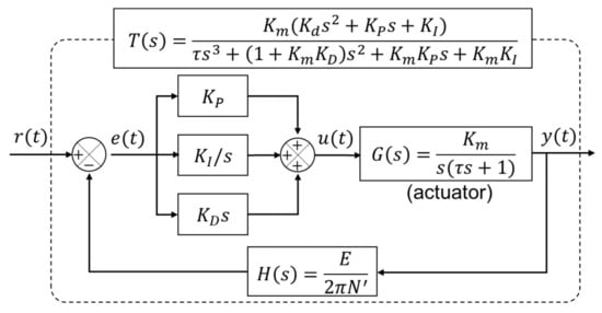 The AMT control system for the tractor was developed using TCU hardware and a PID controller. Position control of the actuators is most important for AMT system performance []. A PID controller for the shuttle shifting and clutch actuators was designed. The actuator control model was developed using the transfer functions of the electric actuator, PID controller, and the potentiometer. DC motor models, as shown in Equations (10)–(12), were used for the actuators, and the PID controller used the general model shown in Equation (13). The transfer function of the potentiometer H(s) is shown in Equation (14). The potentiometer used in this study has a reference voltage () of 5 V and a rotation degree of 270°/360°. As the transfer function was close to one, the transfer function was assumed to be a closed loop; therefore, the transfer function of the actuator control system is shown in Equation (15) and demonstrated in Figure 7.