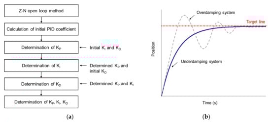 In designing the PID controller for shuttle shifting and clutch actuator control, the determination of PID coefficients is most important []. The initial PID coefficients were determined using the Ziegler–Nichols (Z–N) method and Equations (16)–(18) based on the delay time () and time constant (). To determine the PID coefficients, the response and stability of the system performance were analyzed, in the order of the KP, KI, and KD coefficients []. KP was determined by selecting an initial KI and KD, and KI was determined using the determined KP and initial KD. Finally, the KD coefficients were determined using the determined KP and KI. Figure 8a shows the procedure of determining the PID coefficients. Lower overshoot, settling time, and steady-state error lead to better control performance parameters of the actuators. In this study, the shuttle shifting actuator was controlled by overdamping with a minimal settling time and steady-state error, regardless of overshoot. The clutch actuator was controlled by underdamping with no overshoot, as well as minimal settling time and steady-state error, as oscillation should not occur, as shown in Figure 8b. A stability evaluation was also conducted by calculating relative stability using the Nyquist stability criterion, which is one of the basic tools for stability criteria in the frequency domain using the two parameters of gain margin and phase margin. This criterion is useful for determining the stability of a feedback control system [].