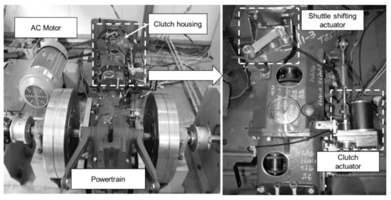 In this study, the automated clutch system was developed for application in a utility tractor (U62, LS Mtron, Korea) which is mostly used for paddy farming in Korea. This tractor model was equipped with a mechanical engine with 45 kW power at 2500 RPM, which is the rated engine rotational speed. The specifications of the tractor were as follows: MT, four-wheel drive, dimensions of 3778 (L) × 1775 (W) × 2531 (H) mm, and total weight of 2296 kg. The synchro-mesh-type manual transmission installed in the tractor comprised two direction gears, four driving shift gears, and four range shift gears. The experimental test-bed was constructed using the tractor’s powertrain, clutch housing, AC motor (HS-45/2, Hyundai, Korea) instead of engine, three-phase inverter to control the motor speed, two actuators, and links, as shown in Figure 9. The motor was selected as identical to the tractor engine specification, and the rated torque and rotational speed were 175 Nm and 2500 RPM, respectively. A magnetic proximity sensor (MP-981, ONO SOKKI, Japan) was installed to measure the rotational speed of the engine shaft and drive shaft. In addition, the pulse signals from the sensors were measured by a digital input module (NI 9401, National Instruments, USA), which is capable of bidirectional communication with a maximum clock rate of 10 MHz. An analog input module (NI 9205, National Instruments, USA) with 100 kS·s−1 sampling rate and 16-bit resolution was used to measure the signals from the potentiometer in the actuators. A motor driver (KDD850UH, Kaesung Control LAB, Korea), which is capable of bidirectional control with a range of voltage outputs between 0–12 V, was used to control the positions of the actuators. To control the motor driver, an analog output module (NI 9263, National Instruments, USA) capable of voltage output in the range between −10 and 10 V was used. Data were acquired by a data acquisition module (NI cDAQ-9172, National Instruments, USA) with a 5 MS·s−1 sample rate. To control the actuators installed in the experimental test-bed, an automatic control program capable of controlling I/O modules was developed using LabVIEW (Version 2009, National Instruments, USA), which is capable of various signal processing functionalities, where the control period was determined at 0.200 s.