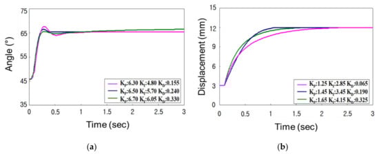 Comparison result of position control of (a) shuttle shifting actuator and (b) clutch actuator according to PID coefficients.