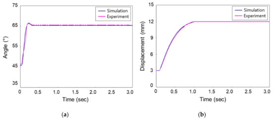 The simulation results of the control performance of the actuator was verified through laboratory experiment using the optimal PID coefficients selected as a result of the simulation above. It was performed for shuttle shifting actuator and clutch actuator, respectively, and the results are shown in Figure 11. In both actuator cases, the response performances in the simulation and the experiment were similar. Table 3 shows the results of the comparison of response performances by simulation and experimental results of the shuttle shifting actuator and the clutch actuator. The response performance showed less than 5% difference between simulation and experiment under all conditions. Thus, it was confirmed that the developed simulation program reflected the characteristics of the actuator well, such that it can control the shuttle shifting actuator and clutch actuator.