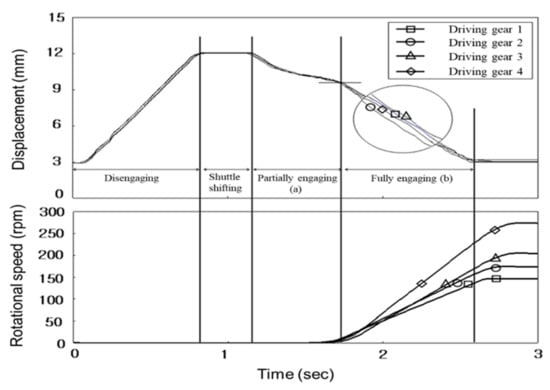 The automatic shifting performance of the AMT system was evaluated through repeated tests of clutch engagement and disengagement with the shuttle shifting actuators using the experimental test-bed. For performance evaluation, the AC motor was driven at 2500 RPM and the clutch was continuously controlled for disengaging and engaging, according to each experimental condition. The performance of F/R automatic shifting was evaluated using total duration time and RPM reaching time during shifting. The total duration time is an important factor in determining the quality of the transmission and is a main indicator in the performance evaluation of the AMT system. It was calculated by the sum of the clutch disengaging time, the shuttle shifting time, and the clutch engaging time when a gear was shifted. When a gear shifts, since the power is transmitted from the semi-clutching section and then the RPM increases, the AMT system affects the target RPM reaching time. Thus, the RPM reaching time was used as an indicator for the performance of semi-clutching of the clutch in the AMT system. Table 1 shows the calculated transmission RPM, using each gear ratio of F/R, at the rated engine rotational speed (2500 RPM). The calculated transmission RPM is one of the performance indicators of the AMT system, which indicates the target value that the transmission should reach when the clutch is engaged at each gear stage; this was used to analyze the RPM reaching time.