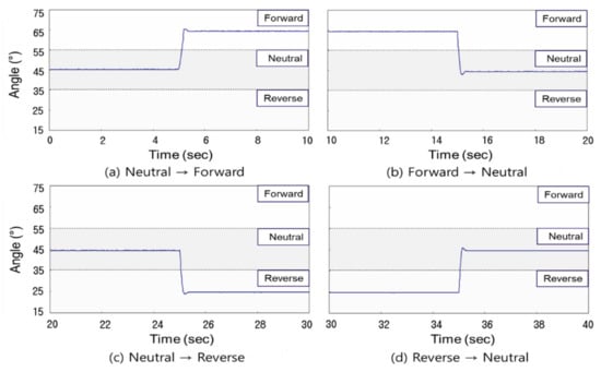 The initial PID coefficients were selected using the delay time and time constant based on Equations (16)–(18). The delay time and time constant of the shuttle shifting actuator were 0.137 and 0.410 s, respectively, when gear-shifting from neutral to forward, and were 0.145 and 0.380 s, respectively, when gear-shifting from neutral to reverse. The delay time and time constant showed similar ranges in both cases. In this study, the initial PID coefficients for the shuttle shifting actuator were selected as KP = 3.43, KI = 12.25, and KD = 0.24, using average values (delay time: 0.140 s, time constant: 0.400 s). The response characteristics of the potentiometer were measured assuming the Z–N step-response to move from disengagement to engagement, in order to select the initial PID control coefficients of the clutch actuator. As the delay time and time constant were 0.190 and 0.310 s, the initial coefficients KP = 1.96, KI = 5.16, and KD = 0.18 were selected.