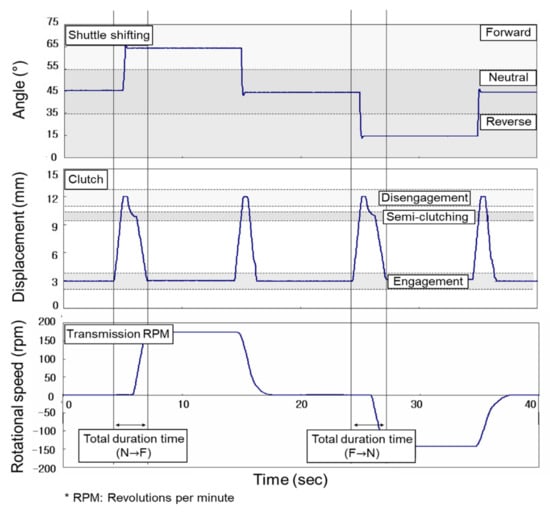 The results of the performance evaluation of the F/R automatic shift control under range shift: 3rd, and driving shift: 2nd are shown in Figure 14. According to the F/R automatic shifting, the signals of the shuttle shifting and the clutch actuators satisfied the shift range for all cases of forward, neutral, and reverse. For automatic shuttle shifting control from neutral to forward and from neutral to reverse, the response performance is shown in Table 6. The response performance was not affected by the gear stages. The performance of total duration time and RPM reaching time was higher in neutral → reverse than neutral → forward under the same gear stage. In all cases of neutral → forward and neutral → reverse, the total duration time was within 2.50 s, regardless of the gear stage, and the target RPM reaching time was within 3.00 s. In the case of forward → neutral and reverse → neutral, motor power was not transmitted to the transmission. Thus, this case was excluded from the measurement. The total duration time (i.e., shifting time) of the developed AMT system was confirmed to be applicable by comparing with the results of previous studies; for example, AMT in an automotive car achieved 2.62 s []; power shift, 3.00 s []; and power shuttle, 2.90 s [].