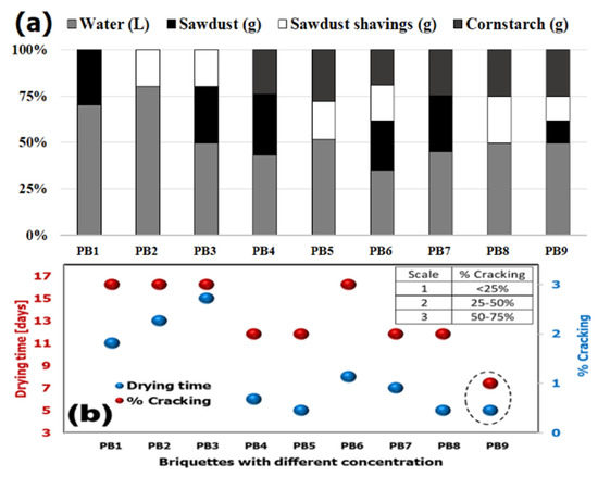 (a) formula for briquette production; (b) evaluation of drying time and percentage of cracking.