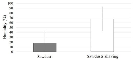 For the samples of sawdust and shavings collected, the moisture content for both of the wood of the genus Pinus ranged from 18.00–67.82% (Figure 5). This figure is lower than in earlier studies [51], but adequate for elaborating densified materials, since they will not require a lengthy drying process to reach a value suitable for producing solid biofuels [38,52].