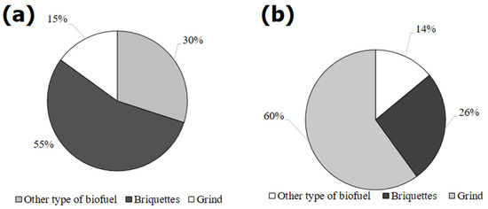 These results indicate that the material used does not require extensive milling to obtain a suitable particle size for briquette-making, as the 0.5 to 2.00 mm screens separated an average of 13.7–35.9% [55]. Those screens produced an estimated percentage of 26.9% for wood of the genus Pinus. The granulometric analysis of the shavings showed that 26.2% can be utilized to produce briquettes, and 13.7% to manufacture other types of biofuel, such as pellets. The remaining 60.1% can be re-processed as indicated above for the sawdust (i.e., re-milling or mixing). Both cases are illustrated in Figure 6.