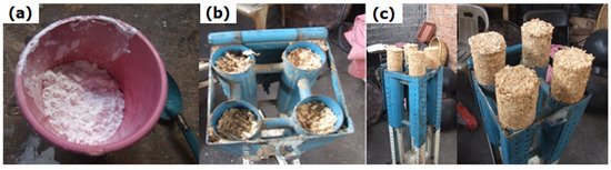 Prior to the briquette-making process, we developed a mechanical apparatus to densify the raw material collected [47]. This apparatus is shown in Figure 2.