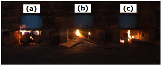 For this analysis, 1 kg of each fuel was placed in the combustion chamber under the metallic plate. Each sample was ignited with 50 g of ocote (wood impregnated with pine resin, Pinus leiophylla), which were introduced simultaneously in the three combustion chambers to systematize the experiment and ensure adequate ignition (Figure 9).
