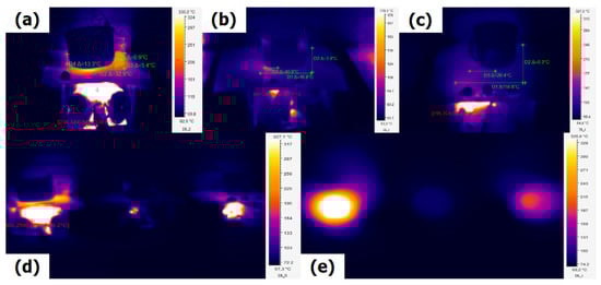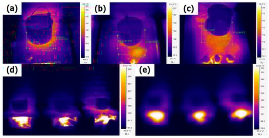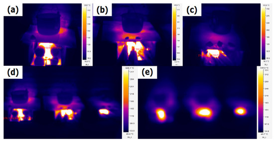 Figure 10d shows that all three fuels emitted energy in the form of a radiant body, where all the temperatures emitted in a given area are observable. This figure reveals that the briquettes had a radiative thermographic spectrum with temperatures of 54.8–335.6 °C, while the pine firewood reached temperatures between 69.2 and 102 °C, and the oak firewood a range of 102–215 °C. Figure 10e presents an integrated image to compare the three fuels. In this stage, the briquette emitted the highest thermal yield at 321.1 °C.