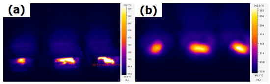 This analysis found that the three fuels emitted energy in the form of a radiant body in a given area. The briquettes and pine and oak firewood reached temperatures of 87.0–335.9 °C, 54.8–335.9 °C, and 49.7–335.9 °C, respectively. This image was taken after 50 min of combustion.