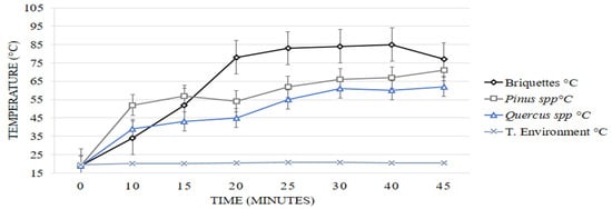 Figure 11 presents the thermal yield of the three fuels analyzed after 45 min of combustion. In that period, the briquettes and pine and oak firewood reached maximum temperatures of 335.7, 336.8, and 323.6 °C, respectively.