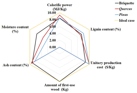 Figure 15 shows the indicators used in the analysis to identify the potential of the briquettes produced compared to conventional fuels. This graphic presentation allows the reader to appreciate the strengths and weaknesses of various aspects, from a focus on energy, to one on economics, to one on the environment. The indicator calorific power shows that the relation of the three fuels is similar, as no significant differences were found. In terms of lignin content, the relevant indicators report similar values, although the oak-based fuel was higher. With respect to the unitary production cost, the graph shows that the cost of producing briquettes is higher than that of pine or oak firewood, but it is important to understand that firewood is simply extracted from forests directly, and does not undergo any transformation process to turn it into fuel. The material for the briquettes, in contrast, is obtained from the sawing process so the cost added is only that of converting wood into densified material. For the indicator amount of first-use wood, the graph shows that the briquettes–a non-first-use wood–are made of waste material that is exploited to generate added value to a process (sawing) that produces solid waste. In terms of this indicator, then, the briquettes represent the ideal case. Turning to the ash content of the three fuels, we find that it is low, a property that makes them ideal for combustion, especially for all manner of domestic tasks. Finally, for the factor moisture content the study found that the initial moisture of the material used to make the briquettes is much lower than the values for pine and oak firewood. Thus, in this aspect, the briquettes differ significantly from the other two fuels. In synthesis, the briquettes represent a fuel that is competitive with pine and oak firewood in all three parameters considered: economic, energy, and environment. Conclusion: these briquettes constitute a fuel source that has positive indicators of sustainability.