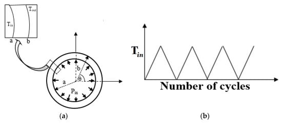 The axisymmetric, sufficiently long FGM pipe with the inner and outer radii a and b, respectively, exposed to internal pressure Pin and cyclic bending moment M, as illustrated in Figure 1a,b, is considered. The pattern of the employed cyclic bending moment M is presented in Figure 1b.