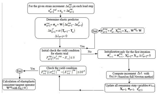 where ,, , and were defined in Equations (37), (28), (46), (32) and (47). The stress integration method applied for the present elastic–plastic constitutive equations through the user-defined material subroutine (UMAT) is summarized and presented in Figure 3.