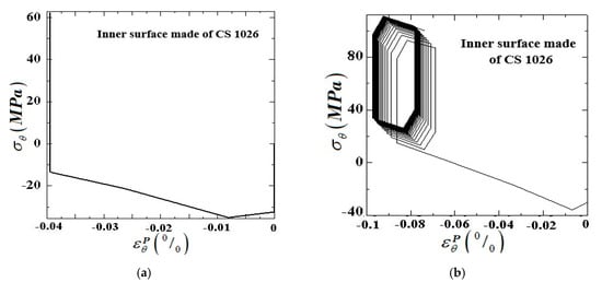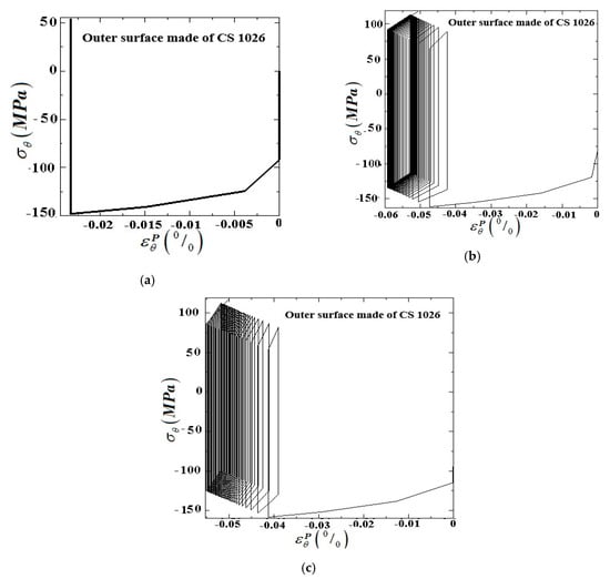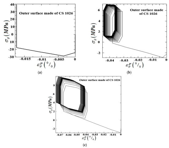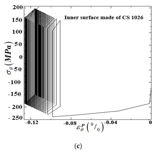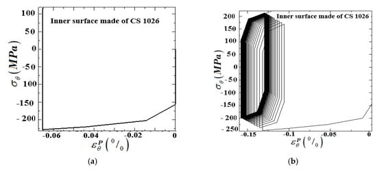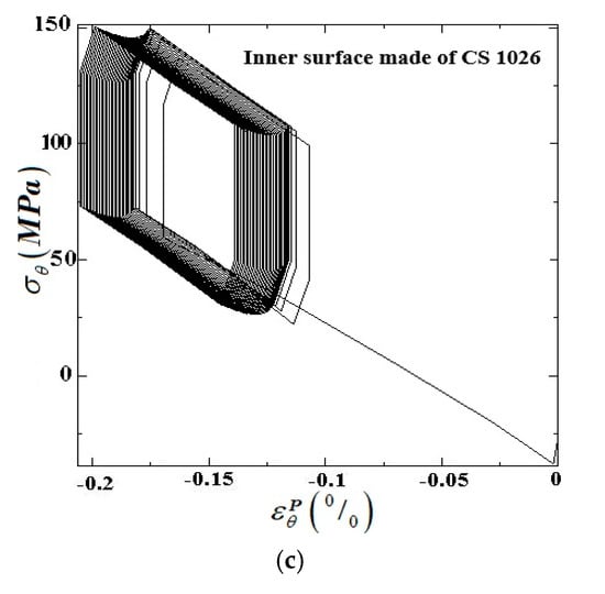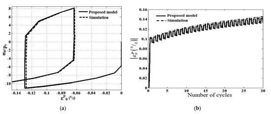 According to Figure 10a,b, it is easily realized that the predicted dimensionless circumferential stress–plastic strain curve by the present approach agrees well with those obtained by ABAQUS simulation. Figure 11, Figure 12 and Figure 13 show the cyclic elastoplastic behavior of the FGM pipe subjected to steady internal pressure and a cyclic through-thickness temperature gradient, as illustrated in Figure 2b, using the corresponding material given in Table 1 and the ratio of outer to inner radii of 1.3.
