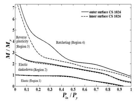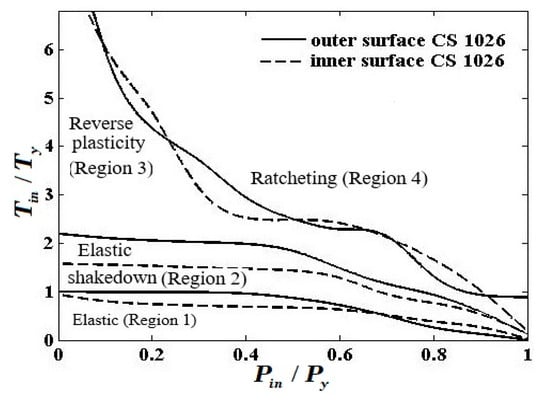 From Figure 7 it is possible to note that for the FGM pipe with its outer surface made up of CS 1026, the reverse plasticity domain is significantly larger than in the case of the FGM pipe with the inner surface made up of CS 1026. This means that changing the FGM properties through the thickness has a significant influence on the size of the ratcheting domain. The deviation between the curves which specify the boundary between the ratcheting and plastic shakedown domains is much more noticeable between 0.2 and 0.4 normalized steady internal pressure. It is also noticed that the curves specifying the elastic and elastic shakedown ranges are almost overlapping in both designs of FGM pipe. From this output, it can be inferred that the variations of material properties are the most critical points within the FGM pipe since they control the ratcheting responses as the root cause of failure.