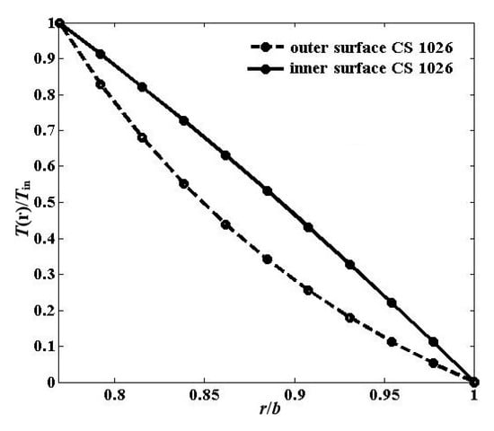 Temperature profiles through-thickness of the FGM pipe with b/a = 1.3 for two prescribed FGM profiles including the inner and outer surfaces made of CS 1026.