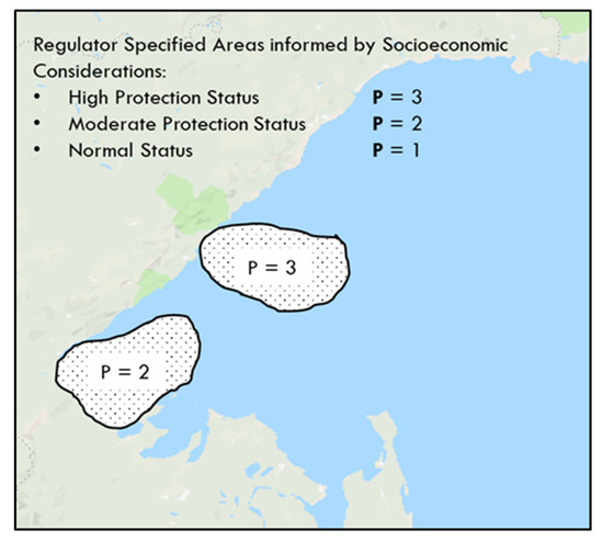 In the context of the proposed consequence category risk framework, regions of particular socio-economic value (e.g., local areas of high cultural significance, high significance to traditional activities, with designated special status such as United Nations Education, Science, and Cultural Organization (UNESCO) sites, etc.) could be mapped as having a particular Protection (P) category designation. Such information would indicate areas of high, moderate, and normal status (Table 3).
