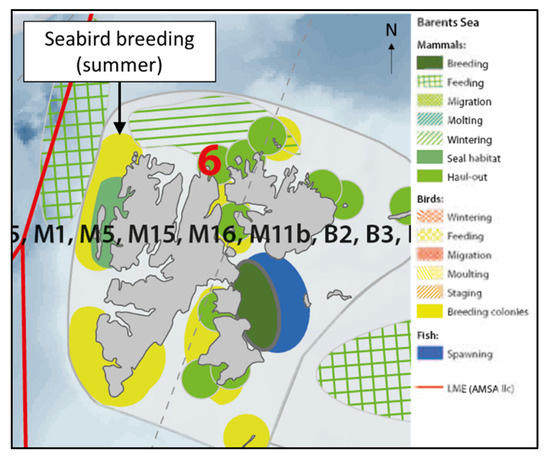 The Arctic Council [24] has reported areas of heightened ecological sensitivity throughout the Arctic, including around Svalbard. Their evaluation considers the impact of Arctic oil spills and other Arctic shipping-related threats on fish, bird, and mammal activities (e.g. migration, breeding, feeding, etc.). The regional sensitivities have a seasonal dependence. During the summer season, a large seabird breeding colony is present off the NW coast of Svalbard (Figure 6). This region is evaluated as having a high ecological sensitivity to oil spills (E = 3).