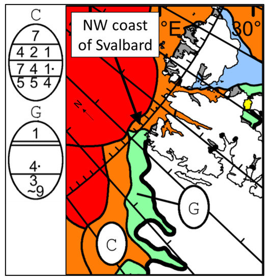 Ice conditions around the North West coast of Svalbard, Norway, 16 June 2019 (modified from Greenland Ice Chart, Danish Meteorological Institute, 16 June 2019 [39]).