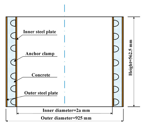 The intake shaft had a net diameter of 8.3 m and a drilling diameter of 10.8 m, making it the largest vertical shaft ever constructed using the mine shaft drilling method in China and elsewhere. According to shaft lining structure design theory [4,5], as the shaft diameter increases, a shaft lining structure with higher strength is required to withstand the high pressure from water and soil in the deep alluvium. Generally, the bearing capacity of a shaft lining could be improved by increasing its thickness, increasing the compressive strength of the concrete [6,7], and using a steel-plate-confined concrete structure. However, due to the limited hoisting capacity of construction equipment, the deadweight of each section of a shaft lining cannot exceed 2000 kN [8], which limits the extent to which the shaft lining thickness could be increased. Meanwhile, for technical reasons relating to site construction, the concrete strength should not be too high. The bearing capacity of the composite structure of steel plate and concrete could be improved when the high tensile strength of steel plate and high compressive strength of concrete are utilized effectively. To improve the composite effect of steel and concrete, anchor clamps are added in the inner steel cylinder and concrete [9,10,11]. Consequently, a dual-steel-plate-confined high-performance composite concrete shaft lining is needed to improve the bearing capacity of the shaft lining [12,13,14]. In other words, a thin and high-strength shaft lining structure should be used to address the challenge of providing support for large-diameter drill shafts.