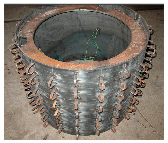 Based on Formula (5), Table 1 summarizes the parameters of the model specimens determined for the model test, the parameters of the full-scale shaft lining, and the dimensions of the loading system for the shaft lining simulation test. Each specimen had an outer diameter of 925 mm and a height of 562.5 mm. Figure 1 shows the sizes of the shaft lining models. One U-shaped anchor was welded onto the inner steel plate surface for every 20 cm2 (shown in Figure 2). The thickness and width of the steel plate for the anchor were 2 mm and 0.5 mm, respectively. The height and width of the anchor were half the thickness of the shaft lining model.