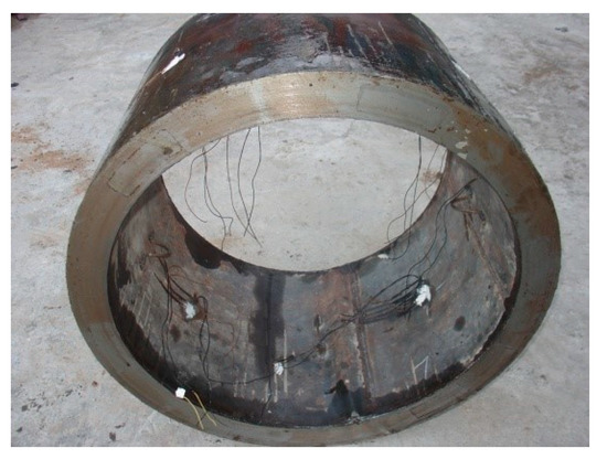 Table 3 summarizes the compressive strength improvement coefficients of the concrete in the composite shaft lining structure calculated using Equation (4) based on the test values of the bearing capacity. As demonstrated in Table 3, due to the constraints exerted by the inner and outer steel plates, the concrete layer in this shaft lining structure was under triaxial compression and, consequently, its compressive strength increased significantly by a factor of 1.97–2.52. This result is consistent with the results reported by researchers in China and elsewhere on the improvement of the compressive strength of concrete under compressive stresses [31,32,33,34]. In addition, the values of the improvement coefficient also meet the requirements for the compressive strength improvement coefficient of concrete in the current standard of China [24], which suggests that this parameter should be taken into consideration in design calculations of this type of shaft lining structure to allow the structure to reflect its actual reliability.