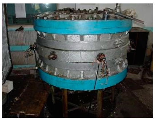 Specimens of the shaft lining model were prepared by pouring concrete into special molds to ensure that the boundary conditions of the two ends of each specimen strictly followed those of the full-scale shaft lining. After curing, the two ends of each specimen were finely machined on a lathe and a grinding machine in a workshop to achieve the smooth finish required for the test. Figure 3 shows a specimen after the machining process. During installation, two rubber seal rings were placed at each end of each specimen model to ensure that the model could slide freely in the radial direction and that its two ends were sealed. To subject each specimen to planar stress during the loading process, rigid bolts were used to constrain the cover plates at its two ends. Figure 4 shows the loading system used in the test. The lateral pressure on the shaft lining was simulated by applying high-pressure oil using an oil pump.