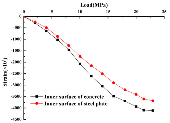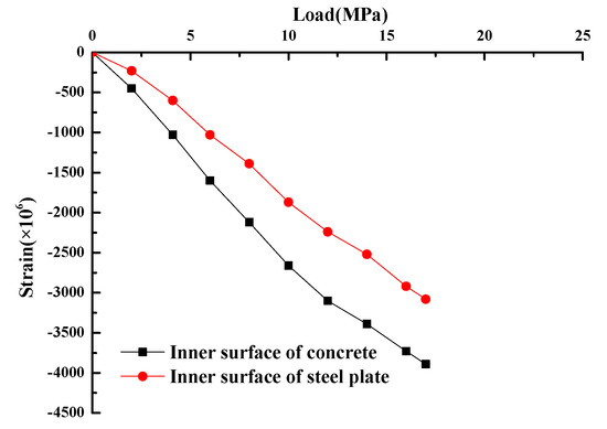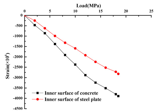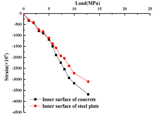 At the initial stage of loading, due to the small load, the hoop strains of the steel plate and concrete composing the shaft lining structure were each linearly correlated to the load. In addition, changes in the strains of the concrete and steel plate were found to display essentially consistent trends. This stage could be viewed as the elastic stage of the shaft lining. The ultimate elastic load of the shaft lining was approximately 30%–40% of the failure load.