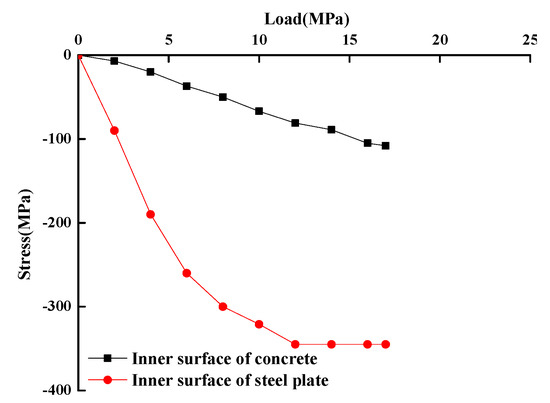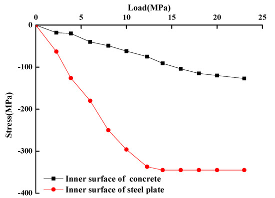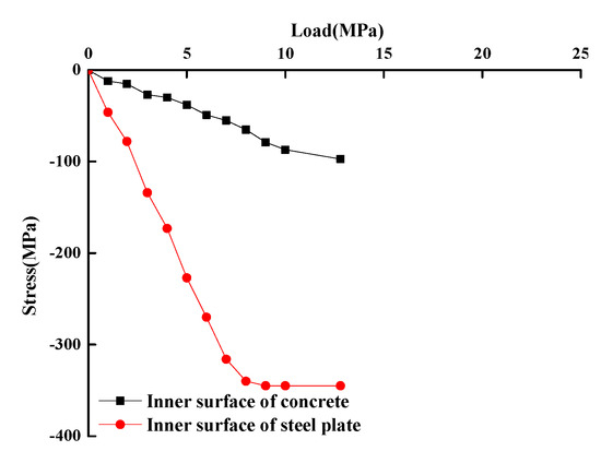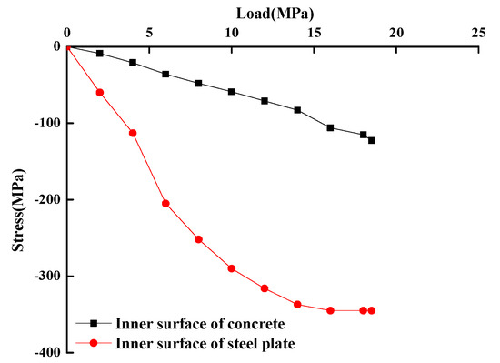 As demonstrated in Figure 9, Figure 10, Figure 11 and Figure 12, when the load was small, the shaft lining structure displayed well-behaved linear elastic characteristics. The stress on the steel plate and the concrete layer both increased nearly linearly as the load increased. As the external load increased, the stress increased at an increasing rate, deviating from the linear pattern. Thus, the shaft lining structure entered the plastic stage. As the specimen entered the plastic deformation stage, the inner steel plate did not buckle and fail because of the anchoring action of the anchor clamps. The inner steel plate, together with the outer steel plate, strongly constrained the concrete layer between them and prevented this layer from undergoing deformation or crack initiation. As a result, the compressive strength of the concrete increased significantly, and this material displayed notable plastic properties [30]. Compared with the test results of the other shaft lining models, a similar change rule of stress was shown.
