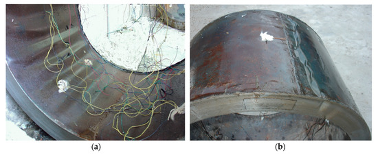 Before the shaft lining models were processed, compressive strength tests of concrete of three grades were carried out using a CSS-YAW3000 electro-hydraulic servo pressure machine manufactured by Changchun Testing Machine Research Institute co. LTD, and yield strength tests of the steel plates were carried out using a WDW-D1000kN universal testing machine. The two tests were conducted according to “Standard of test method of mechanical properties on ordinary concrete” (GB/T 50081-2002) [28] and “Metallic materials—Tensile testing at ambient temperature” (GB/T 228-2002) [29], respectively. According to the tests, the 28-day compressive strengths of C60, C65, and C70 concrete were 61.1 MPa, 66.5 MPa, and 70.8 MPa, respectively, and the lower yield point strength of the steel plate was 341.6 Mpa.