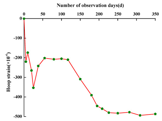 Large amounts of field data were obtained from long-term monitoring. Figure 14 shows the measurements of the hoop strain of the concrete in the shaft lining.