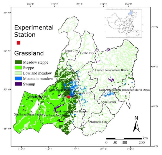 Grassland provides multiple ecosystem functions in both natural and managed systems. It acts as an ecological barrier for, e.g., farmland systems against environmental infringement. It is also by itself a production base of quality livestock products that provide irreplaceable constituents for food and nutritional security at the global scale [1,2,3,4]. However, grassland degradation has extensively been observed in recent years due to over-exploitation [4,5,6,7,8]. The structure, function, and dynamics of grassland ecosystems have received increasing attention in the past few decades in China [8,9,10]. The grassland acreage in China accounts for 3.5 × 106 km2, one-fourth of which is distributed in the Inner Mongolia region [4,11,12]. Located in northeastern Inner Mongolia, Hulunbuir possesses the most concentrated and representative temperate meadow steppe in the whole of China, characterized by its native vegetation, rich biodiversity, and diversified landscapes [13,14]. However, the degradation of Hulunbuir grasslands has become more and more evident, and both technological and policy-level countermeasures are urgently needed [7,15,16,17,18]. The degradation rate in terms of percent area jumped from less than 10% during the 1980s and 1990s to more than 50% during 2000–2010. Grassland degradation has now become not only a hurdle for regional production but also a threat to the eco-environmental balance in wider areas across the country [14,19].