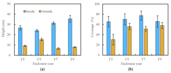 The variations of plant height, vegetation coverage, and plant density in relation to the enclosure duration are given as bar charts in Figure 3. A comparison between the height of the plants inside and outside the enclosure showed that plants inside the enclosure were significantly higher than plants outside the enclosure. In the third year of the enclosure (F3), for example, plants inside were 189.50% higher than plants outside. After 9 years of the enclosure (F9), plants inside reached a height which was 4.5 times that of the plants outside the enclosure (Figure 3a). Overall, plant height inside the enclosure showed a slight decreasing trend until the fifth year and then a more prominent increasing trend, although statistical significance was not attached. The plant height inside the enclosure maximized in year F9, which was 32.26%, 47.17%, and 13.11% higher than previous years, respectively.