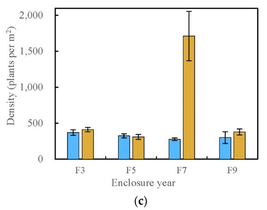 No significant effect of the enclosure was found on plant density (Figure 3c), although density inside the enclosure was significantly lower than that outside the enclosure in year F7.