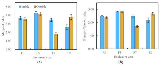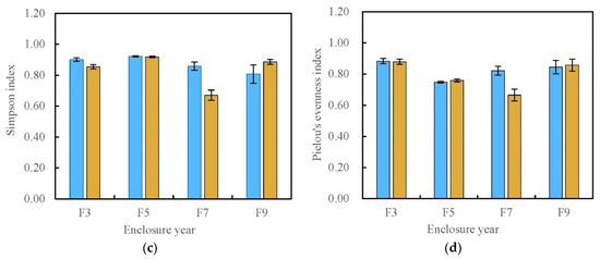 The variations of the Shannon–Wiener diversity index, the Simpson diversity index, the Pielou’s evenness index, and the Margalef richness index values in relation to the enclosure years are shown in Figure 4. The Shannon–Wiener, Simpson, and Margalef indices inside the enclosure were all observed higher than their values outside the enclosure in years F3, F5, and F7. The inside–outside difference of these indices was tested statistically significant in year F7, while significance was not found for the difference in other years. Moreover, only slight inside–outside difference was observed in the Pielou’s evenness index values in years F3 and F5 (Figure 4d). In year F9, all the measurements, regardless of diversity, evenness, or richness, showed lower values inside the enclosure than outside the enclosure, albeit not significant.
