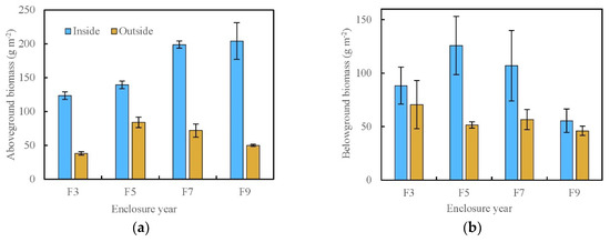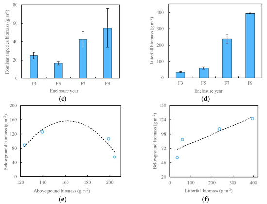 A similar advantage also existed in belowground biomass under the enclosure treatment (Figure 5b). The belowground biomass measured from soils inside the enclosure was found consistently higher than that outside the enclosure. The inside–outside margin was measured at 25.24%, 143.98%, 89.02%, and 20.47% in years F3 though F9, respectively. Different from the all-time growth pattern in aboveground biomass, the belowground biomass showed a trend of first increasing and then decreasing with a turning point in year F5. Belowground biomass in year F5 was higher than years F3, F7, and F9 by 42.44%, 17.56%, and 126.67%, respectively. Similar increasing trends to that of the aboveground biomass were observed in the biomass of dominant plant species and in the litterfall biomass, both inside the enclosure (Figure 5c,d).