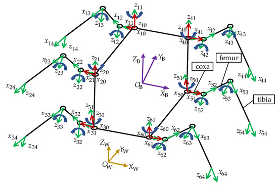 In order to describe the robot quantitatively with a mathematical model, a series of coordinate systems need to be established. A world coordinate system is established to describe the locomotion route of the robot, denoted by the symbol . Then the body coordinate and reference coordinate systems of leg links are established, denoted by the symbols and (i=1,2,3,4,5,6), respectively. Coordinate systems attached to the coxa joint (), femur joint (), and tibia joint () of leg i are established for each joint. The simplified hexapod model and coordinate systems are shown in Figure 2.