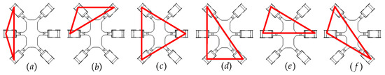 In the practical application of a hexapod robot, leg failure could be caused by the failure of a driving device or power transmission equipment, or by impact. The relationship between the relative position of the fault leg and the fault tolerance of the hexapod robot is analyzed using the support triangle in the tripod gait, which is the design principle to determine the relative position of the support leg in the fault tolerance walking process of the hexapod robot. Figure 3 shows all six possible support triangles for a hexapod robot.