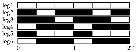 During the locomotion process of a hexapod robot, the foot lifts from the ground and takes a step forward in the transfer phase, and contacts the ground to support the body in the support phase. Based on the F-TT gait phase sequence planning equation, the F-TT gait phase sequence diagram of the hexapod robot in the case of a leg 1 fault is obtained, as shown in Figure 5. The shadow parts represent the support phase, and the blank parts represent the transfer phase.