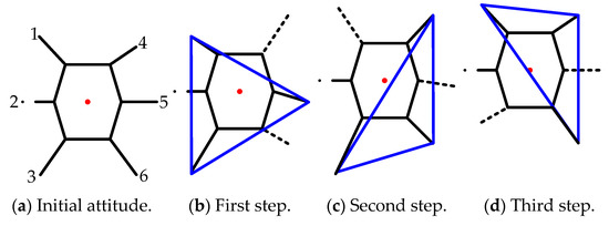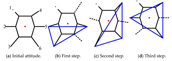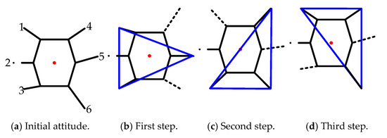 The movement process is divided into three steps, as shown in Figure 6. The dotted line in the figure indicates that the leg is in the transfer phase, the dot-dash line indicates a broken leg, the solid line indicates a normal leg in the support phase, the red point is the COG position of the robot, and the blue triangle indicates the stable area formed by the support legs. When the COG is in the support area, the hexapod can be regarded as stabile, otherwise it will tend to topple.