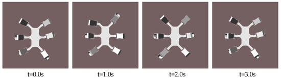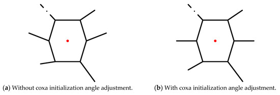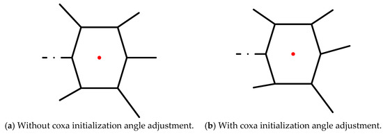 In Section 3.2, when a malfunctioning robot performs the F-TT gait, it has the two states of stability and instability. As the hexapod robot moves, the COG of the hexapod robot will move out of the stable region composed of the supporting legs, resulting in the hexapod robot toppling. Locomotion moment, as shown in Figure 6b,c and Figure 8c, due to the forward movement of the body, causes the COG to gradually move out of stability. Aiming at the instability state of the robot, a measure is proposed to solve the problem of the ineligible stability margin of the hexapod robot with one leg fault: coxa initialization angle adjustment. An initial value of coxa joint angle is preset to increase the support area. For the legs involved in the unstable support state, the support area can be increased by selecting the appropriate coxa initialization angle within the allowed space. Figure 9 and Figure 10 demonstrate the initial attitude with or without coxa initialization angle adjustment. The figure on the left shows the initial attitude without coxa initialization angle adjustment while the initial attitude with coxa initialization angle adjustment is shown on the right.