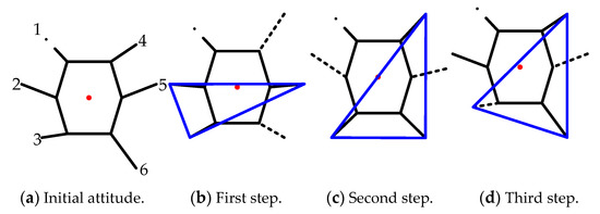 In the second step, legs 4 and 6 touch down, leg 2 is lifted up to swing forward, leg 5 is raised to swing forward at a slower speed, and legs 3, 4, and 6 support the body. Meanwhile, the robot is moved forward passively, and the attitude of hexapod changes from Figure 6b,c.