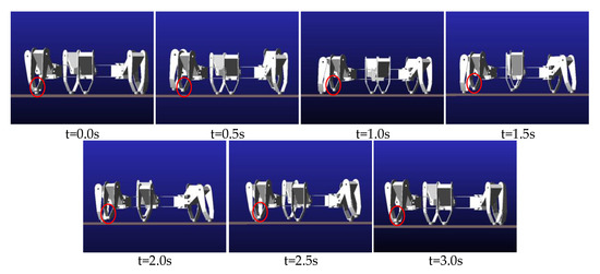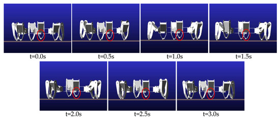 The simulation analysis and walking experiments of the F-TT gait were carried out for the leg 1 fault and leg 2 fault states. Parameters of the physical prototype model used are shown in Table 3. The locomotion period is assumed to be 3 s. Each process is executed in 1 s.
