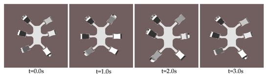 Based on the phase and the duty factor of the F-TT gait equation, the gait phase sequence diagram of the hexapod in the case of a leg 2 fault is obtained, as shown in the Figure 7. The F-TT gait locomotion process of the hexapod robot in the leg 2 fault state is shown in Figure 8; the dotted line in the figure indicates a leg in the transfer phase, the dot-dash line indicates a broken leg, and the solid line indicates a normal leg in the support phase.